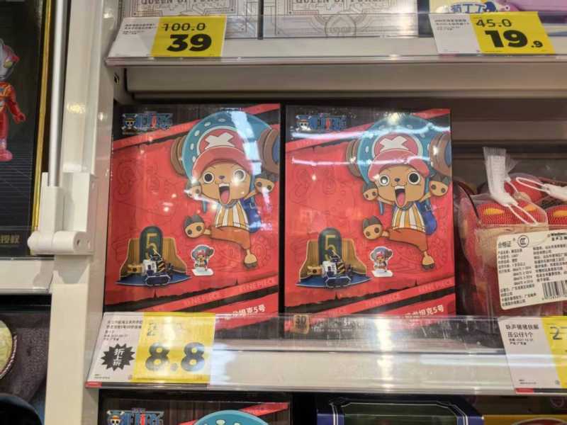 记者走访广州本地商圈发现,在广州荔湾区恒宝广场的好特卖超市的零食货架旁,确实有各式畅销IP盲盒(包括海贼王、蜡笔小新、迪士尼公主系列、叮当等)在低折低价售卖,价格每盒8.8元至39元不等。