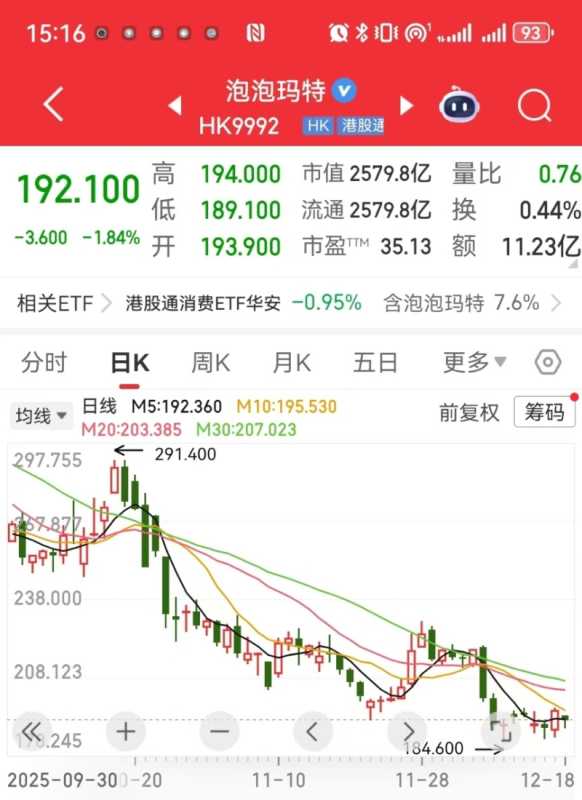 值得一提的是,截至12月9日,泡泡玛特股价下跌,市值蒸发超千亿。截至12月18日发稿前,泡泡玛特股价报192.2港元,最低触及189.1港元,日内跌幅接近2%。