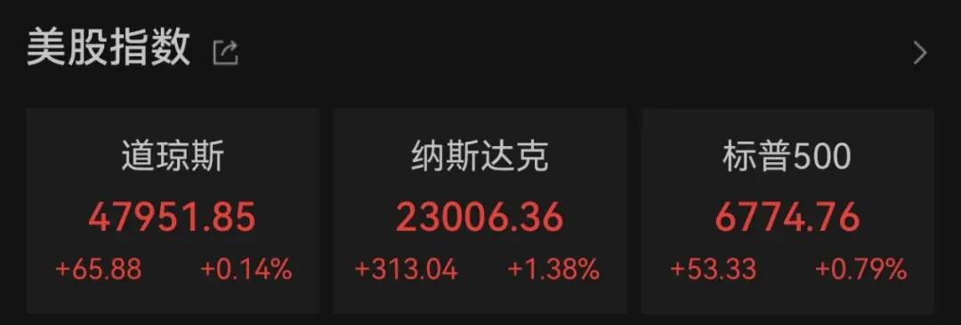 截至收盘,道指涨65.88点,涨幅为0.14%;纳指涨313.04点,涨幅为1.38%;标普500指数涨53.33点,涨幅为0.79%。