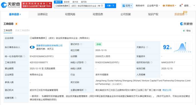 南方财经12月19日电,天眼查工商信息显示,近日,江城国泰海通神工(武汉)创业投资基金合伙企业(有限合伙)成立,执行事务合伙人为国泰君安创新投资有限公司,出资额2亿人民币,经营范围为私募股权投资基金管理、创业投资基金管理服务。合伙人信息显示,该基金由江城产业投资基金(武汉)有限公司、神工股份(688233)、国泰海通旗下国泰君安创新投资有限公司等共同出资。