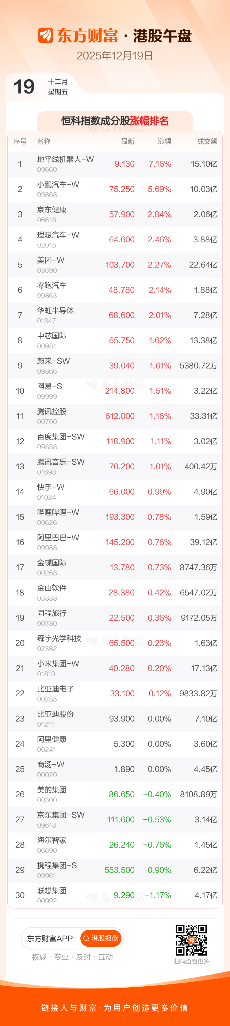 港股12月19日午盘走高,恒生指数和恒生科技指数均有所上涨。部分成分股表现亮眼,但亦有部分股票下跌。本文基于AI生产,不构成投资建议。