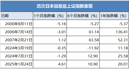 此前日本六次加息后,上证指数短期内跌多涨少,但跌幅均较为可控。从中长期来看,上证指数则是涨多跌少,近五次加息后的1年里,上证指数均实现上涨。