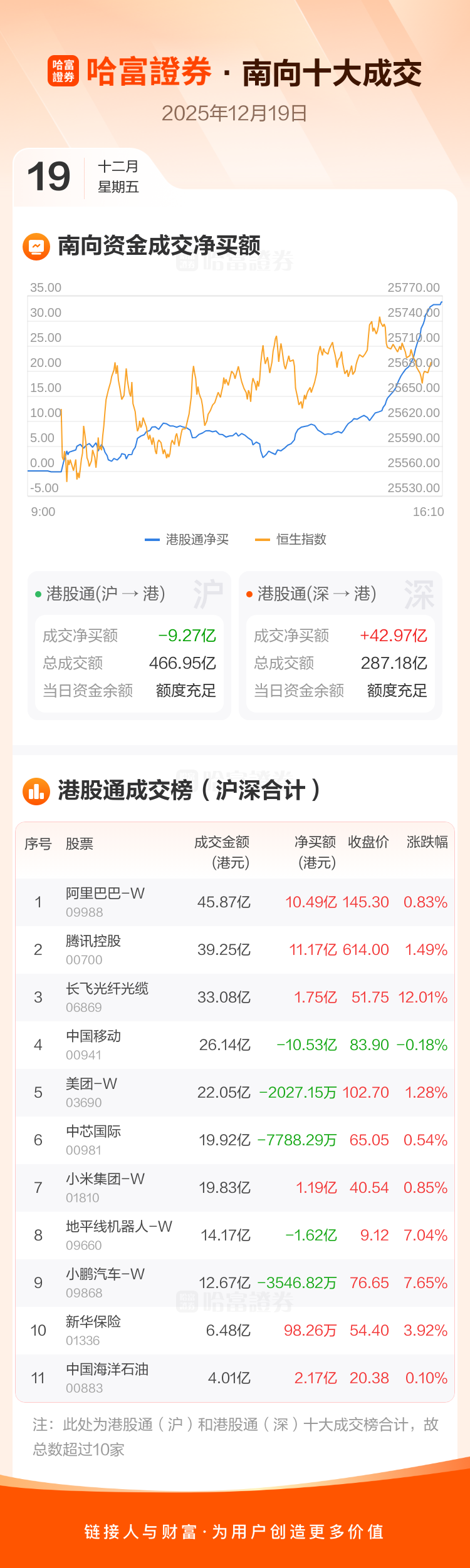 恒生指数12月19日涨0.75%,收报25690.53点。南向资金今日净买入港股33.71亿港元。南向资金今日成交额754.13亿港元,港股大市成交2211.86亿港元。