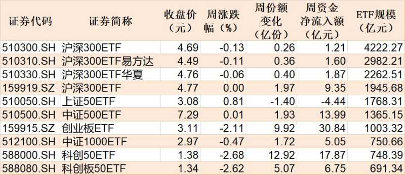 具体ETF方面,规模较大的10只宽基指数ETF本周合计净流入84.1亿元,其中创业板ETF净流入30.84亿元。