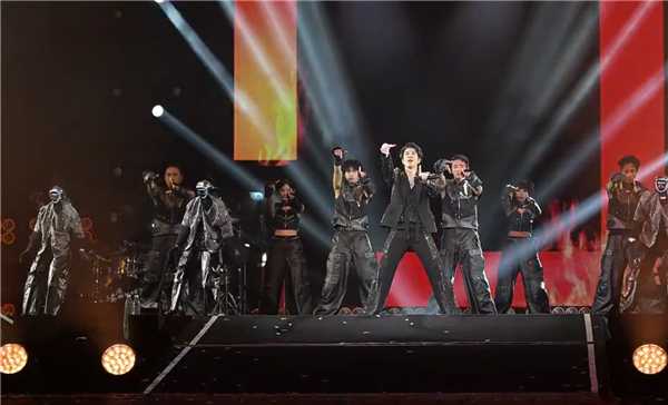 6名宇树科技G1机器人身着银色亮片服装,精准卡点音乐节奏,动作与王力宏及其伴舞高度同步。最后表演以机器人一起完成高难度“韦伯斯特”空翻结尾,燃炸全场。