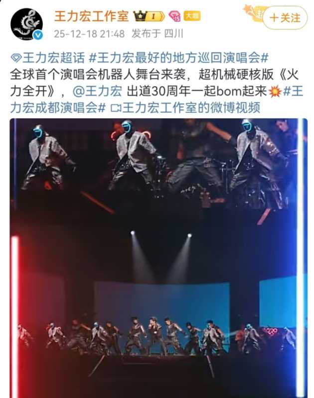 据悉,12月18日,王力宏成都演唱会首次引入人形机器人伴舞,共同演绎《火力全开》,实现了全球首个演唱会机器人舞台。