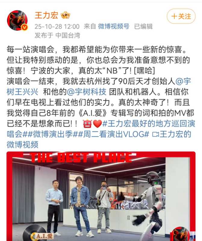 据悉,这场机器人舞台秀并非突然诞生,早在两个月前,王力宏在社交媒体上表示,他曾专程前往宇树科技,与创始人王兴兴交流,参观了解机器人技术。