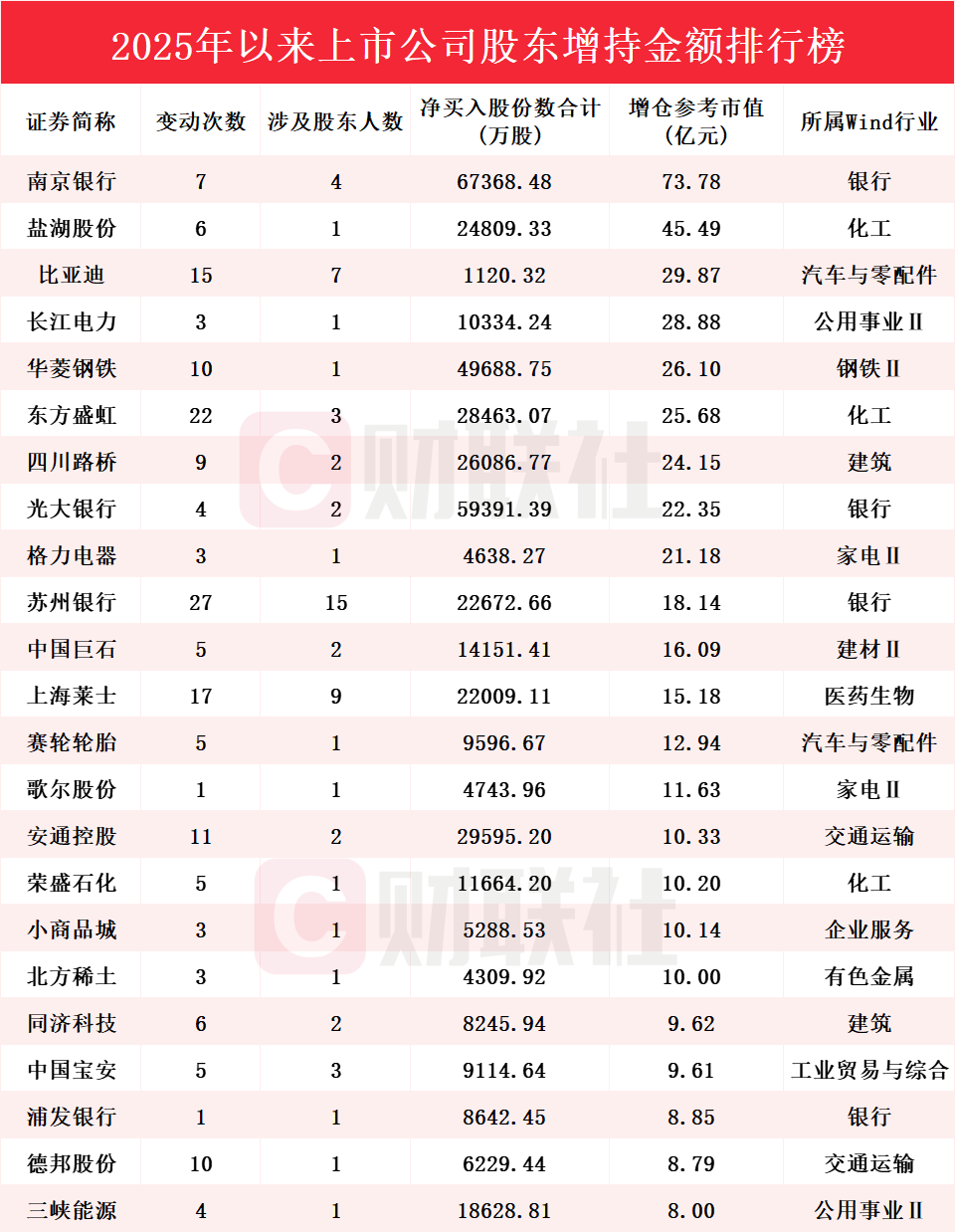总市值1411亿、主要产品是商业银行业务的南京银行年初迄今获股东增持金额总计73.78亿元。南京银行11月21日发布公告称,法国巴黎银行(QFII)在9月29日至11月20日期间,以自有资金增持南京银行股份约1.28亿股。此次增持后,法国巴黎银行及法国巴黎银行(QFII)合计持股比例由17.02%跃升至18.06%。南京银行12月17日公告称,公司拟于2025年12月23日全额赎回0.49亿股优先股“南银优1”。为保证公平信息披露,维护投资者利益,公司拟申请于2025年12月22日对本次优先股停牌,并于2025年12月23日对本次优先股赎回注销。