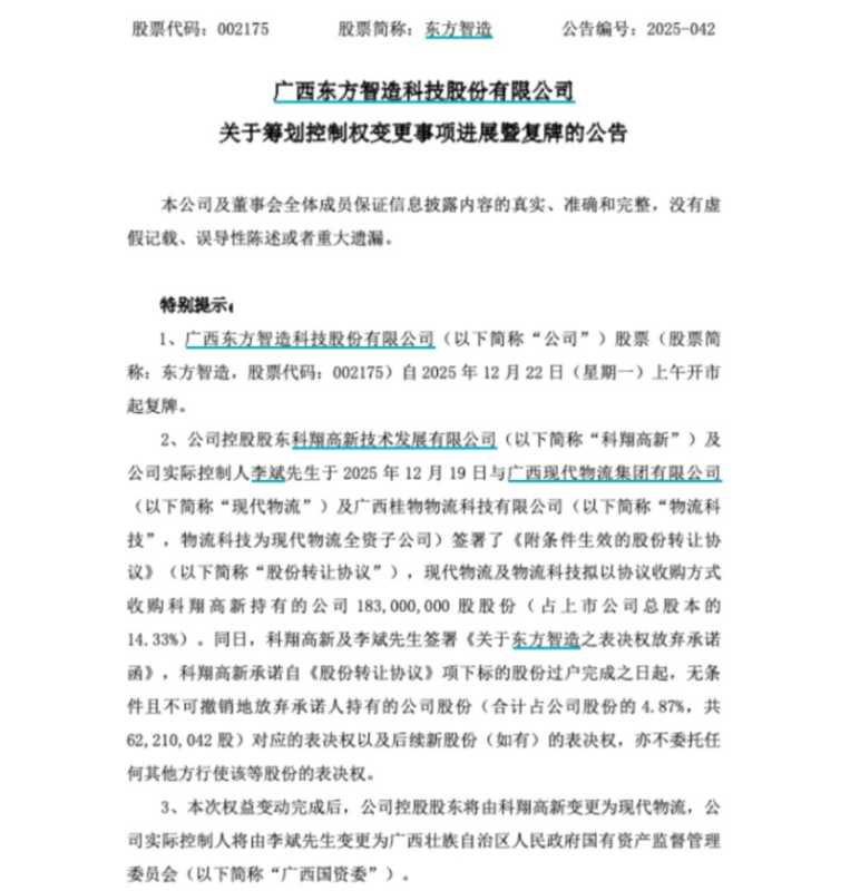 12月19日晚间,东方智造(002175)、中国高科(600730)均发布了《关于筹划控制权变更事项进展暨复牌的公告》,公告显示,两家公司或分别迎来地方国资入局,公司股票均将自下周一(12月22日)上午开市起复牌。