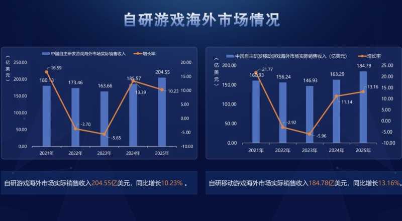 数据显示,2025年,自主研发游戏国内市场实际销售收入2910.95亿元,同比增长11.64%,除得益于头部长青产品稳定支撑外,多款自研新品也带来明显增量。其中,自研游戏海外市场实际销售收入204.55亿美元,同比增长10.23%,规模已连续六年超千亿元人民币。