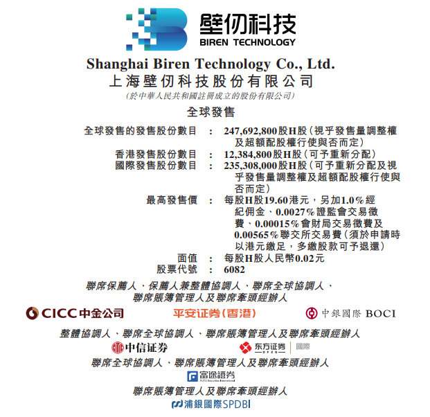 壁仞科技在港交所公告,在港上市拟发行247,692,800股H股,定价区间介于17至19.6港元/股。预期H股将在明年1月2日开始交易。