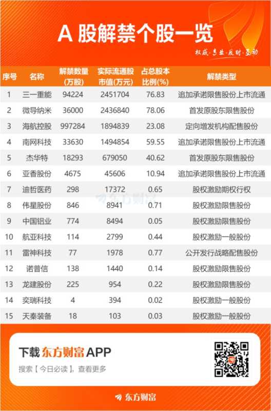 东方财富Choice数据显示,明日将有15只股票面临解禁,解禁量及市值巨大。其中,三一重能、微导纳米、海航控股的解禁市值位居前列。此外,文章还提及了部分股票的解禁比例。