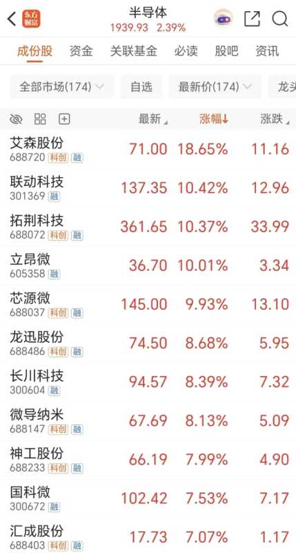 周一(12月22日)半导体板块大爆发,个股方面,艾森股份涨近19%,联动科技、拓荆科技涨超10%,立昂微等个股涨停。