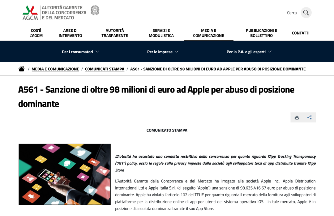 意大利竞争与市场管理局表示,经调查认定,苹果公司的应用跟踪透明度政策(ATT)存在限制竞争行为。