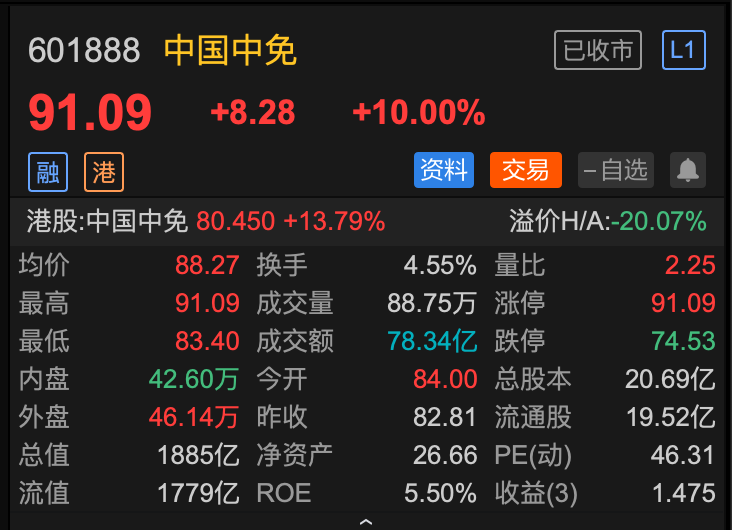 受此影响,12月22日收盘,海南离岛免税板块头部企业中国中免(601888.SH)涨停至91.09元/股,总市值达1885亿元。