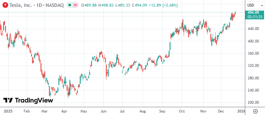 周一(12月22日)美股盘中,特斯拉股价一度涨3.66%至每股498.82美元,刷新了上周四录得的历史纪录,接近每股500美元关口。