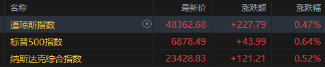 截至收盘,道琼斯指数涨0.47%,报48362.68点;标普500指数涨0.64%,报6878.49点;纳斯达克综合指数涨0.52%,报23428.83点。