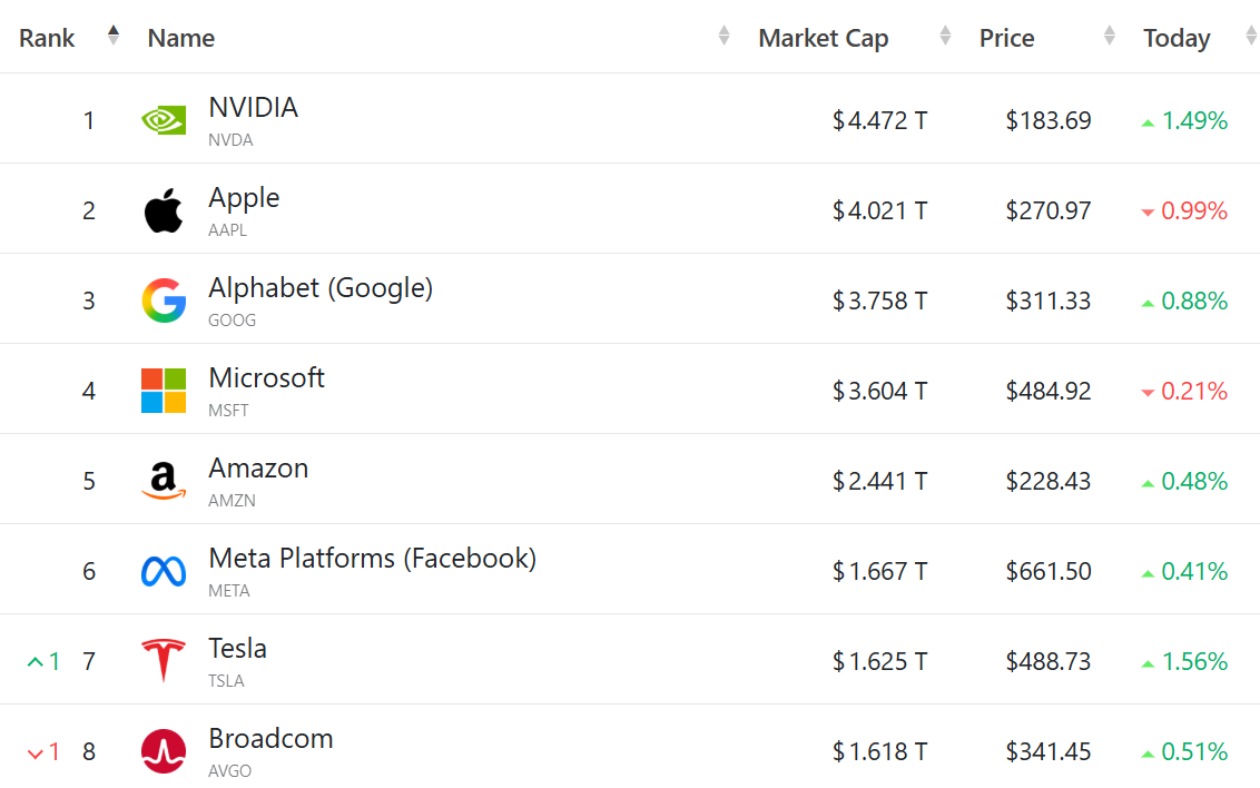 大型科技股多数收涨,英伟达涨1.49%,苹果跌0.99%,谷歌C涨0.88%,微软跌0.21%,亚马逊涨0.48%,Meta涨0.41%,特斯拉涨1.56%,博通涨0.51%。