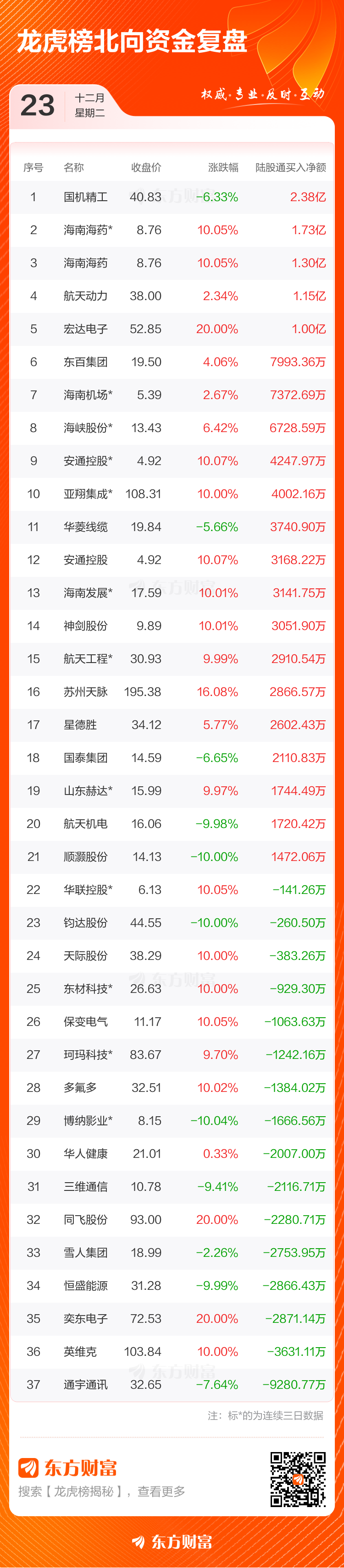 12月23日共有75只个股上榜龙虎榜,总上榜成交额为249.68亿元。其中,英维克当天净买入额最高,达到8.42亿元。此外,保变电气当天也备受关注,游资席位净买入金额最高,达到1.49亿元。