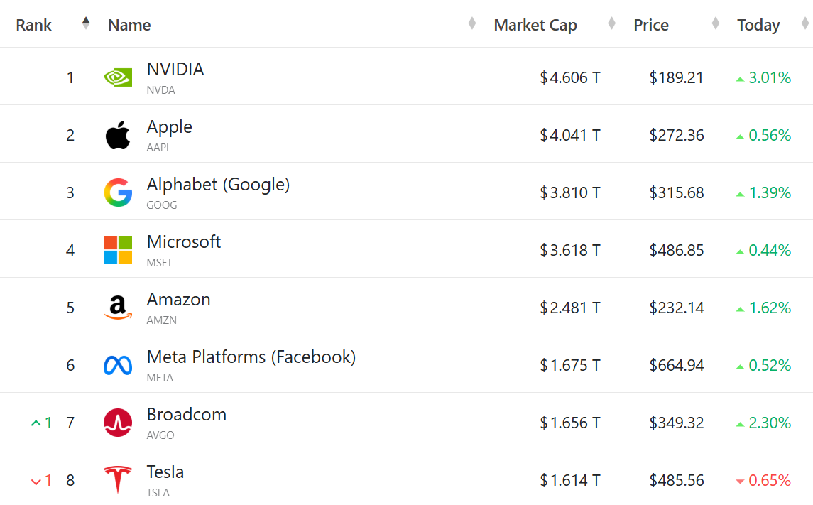 苹果涨0.56%,谷歌C涨1.39%,微软涨0.44%,亚马逊涨1.62%,Meta涨0.52%,博通涨2.3%,特斯拉跌0.65%。