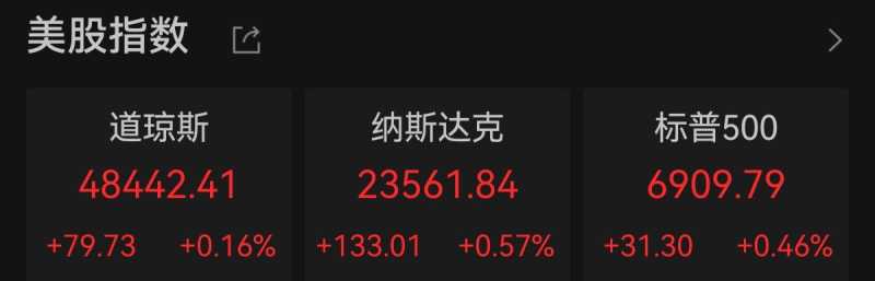中新经纬12月24日电美东时间周二,美国三大股指均录得四连涨,标普500指数创收盘新高。截至收盘,道指涨0.16%报48442.41点,纳指涨0.57%报23561.84点,标普500指数涨0.46%报6909.79点。