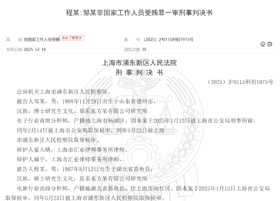 上海市浦东新区人民法院12月18日公开的一审判决书显示,被告人邹某,男,1988年11月29日出生于山东省德州市,博士研究生文化,原系东方某有限公司(以下简称“东方某公司”)研究所电子行业首席分析师;被告人程某,男,1987年8月13日出生于湖北省嘉鱼县,硕士研究生文化,原系东方某公司研究所电新行业高级分析师。