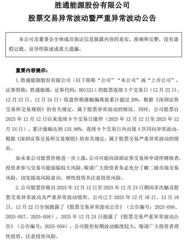 胜通能源12月24日公告,股票连续3个交易日收盘价格涨幅偏离值累计超过20%,属于股票异常波动的情况。同时,股票自2025年12月12日以来连续9个交易日涨停(2025年12月12日至2025年12月24日),累计涨幅达到135.86%,连续9个交易日内出现4次同向异常波动,属于股票交易严重异常波动的情形。如未来公司股票价格进一步上涨,公司可能向深圳证券交易所申请停牌核查,投资者参与交易可能面临较大风险。