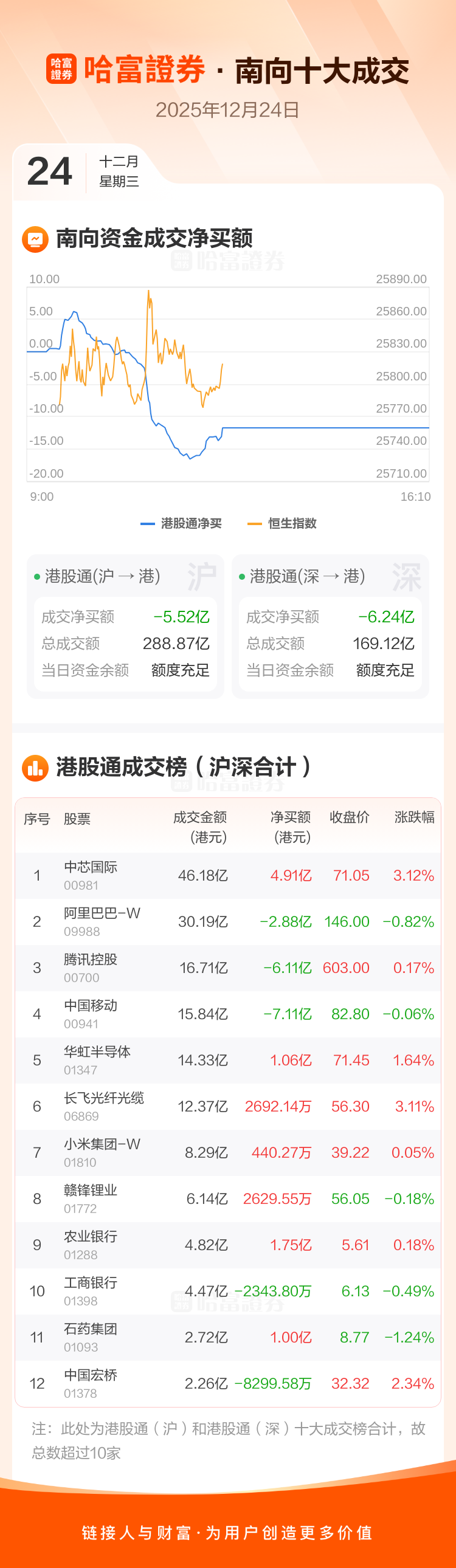 南向十大成交股中,中芯国际、农业银行、华虹半导体分别获净买入4.91亿港元、1.75亿港元、1.06亿港元。中国移动、腾讯控股、阿里巴巴-W分别遭净卖出7.11亿港元、6.11亿港元、2.88亿港元。