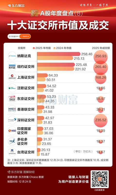 截至2025年12月24日,A股年内总成交额达410.17万亿元。全球股票市值前十的交易所中,深交所排名第三、上交所排名第四。纽交所和纳斯达克稳居前两位。展望2026年,政策红利与产业景气方向受关注。