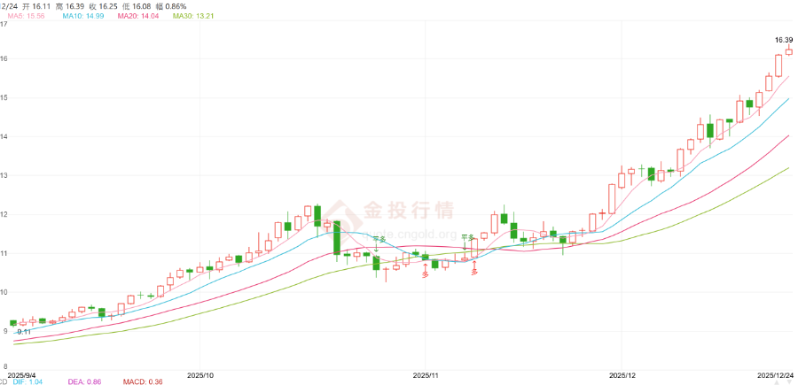 数据显示,12月24日,白银期货和现货价格持续刷新历史纪录。年内,白银期货和现货价格涨幅分别超过130%、150%。