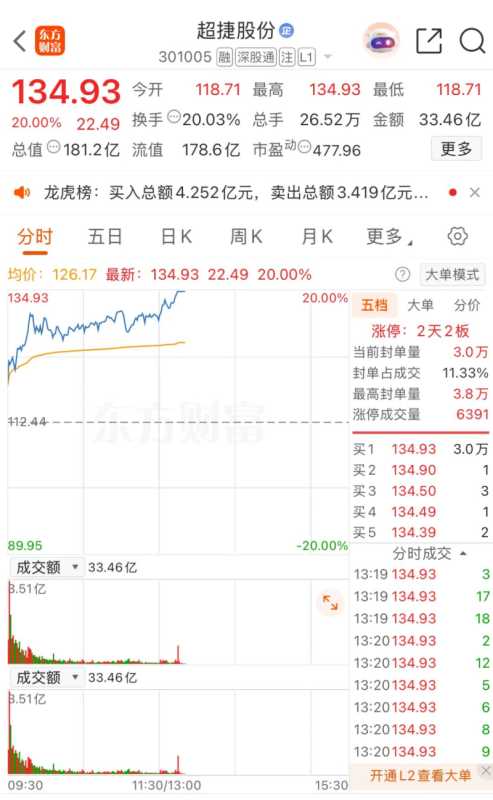 午后,机器人概念持续拉升。昊志机电(300503)午后开盘仅用3分钟“20cm”涨停,首开股份、大业股份、锋龙股份等十余只成分股涨停,埃夫特-U涨超14%,浙江荣泰、巨轮智能等跟涨。