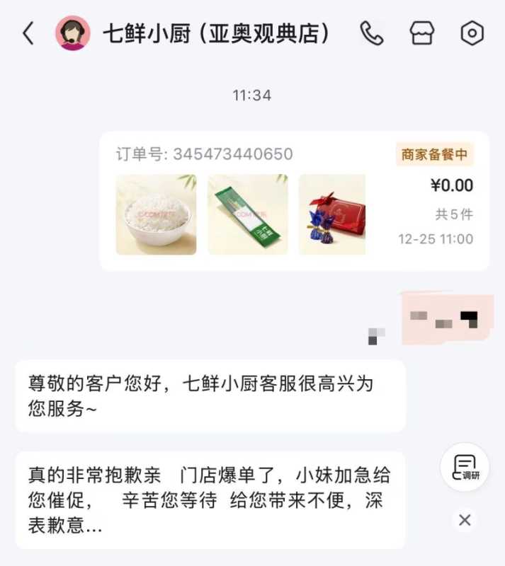 12月25日11时左右,《中国经营报》记者在京东七鲜小厨(亚奥观典店)下单了一笔外卖订单,半个小时后京东客服打来电话,提醒这笔外卖订单没有最新进展,建议与店铺沟通。又过了几分钟后,记者在京东App上与该店铺联系,店家回复“门店爆单了,正加急催促”。