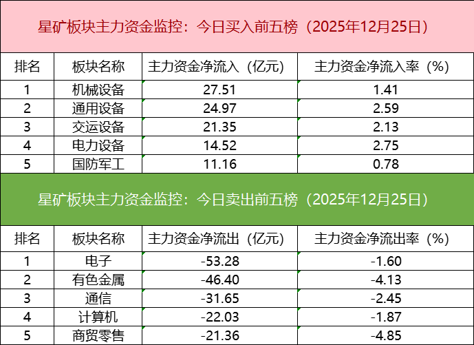 今日港股圣诞节休市,期间北向资金暂停。板块主力资金方面,机械设备板块主力资金净流入居首。ETF成交方面,机器人ETF易方达(159530)成交额环比增长282%。