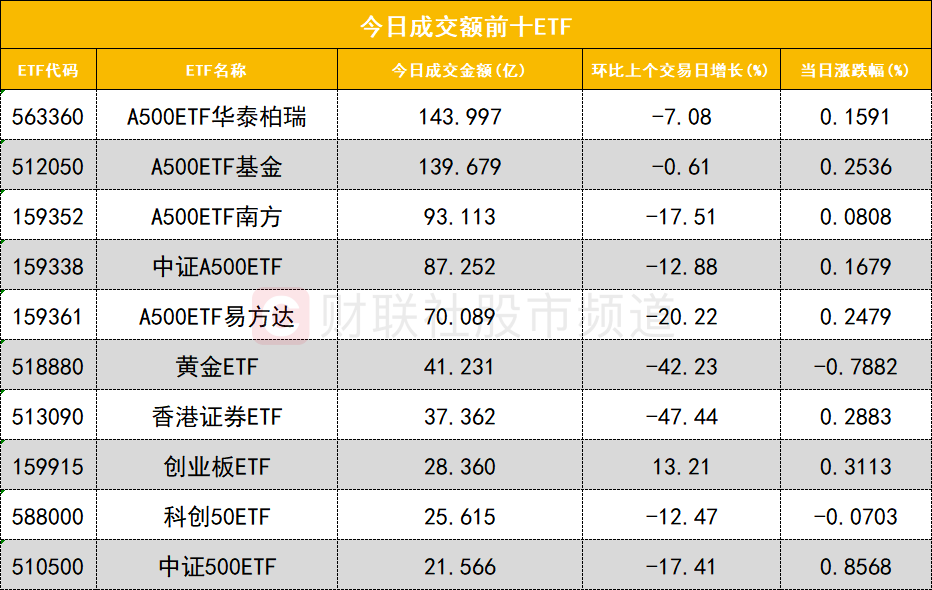 从成交额前十的ETF来看,A500ETF华泰柏瑞(563360)成交额位居首位,A500ETF基金(512050)成交额位居次席。