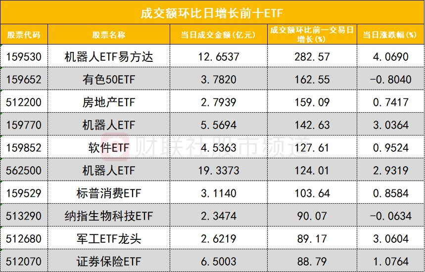 从成交额环比增长前十的ETF来看,机器人ETF易方达(159530)成交额环比增长282%位居首位;有色50ETF(159652)成交额环比增长162%位居次席。