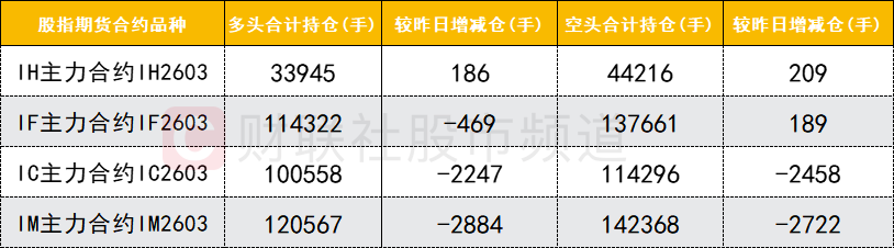 四大期指主力合约中,IC、IM合约多空双方均减仓,IH合约多空双方加仓,IF合约多头减仓而空头加仓。