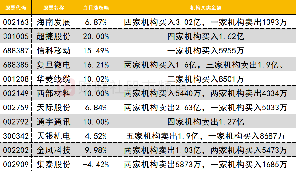 今日龙虎榜机构活跃度较高,买入方面,多家机构涌入海南发展,获四家机构买入3.02亿。三只商业航天概念股获机构买入,超捷股份获四家机构买入1.62亿,华菱线缆获三家机构买入8501万,西部材料两家机构买入5440万。