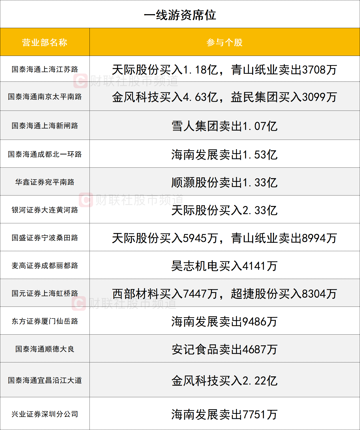 一线游资活跃度较高,金风科技午后涨停,获两家一线游资(国泰海通证券南京太平南路、国泰海通证券宜昌沿江大道)分别买入4.63亿、2.22亿。海南发展遭资金激烈博弈,三家一线游资(国泰海通证券成都北一环路、东方证券厦门仙岳路、兴业证券深圳分公司)分别卖出1.53亿、0.94亿、0.77亿。