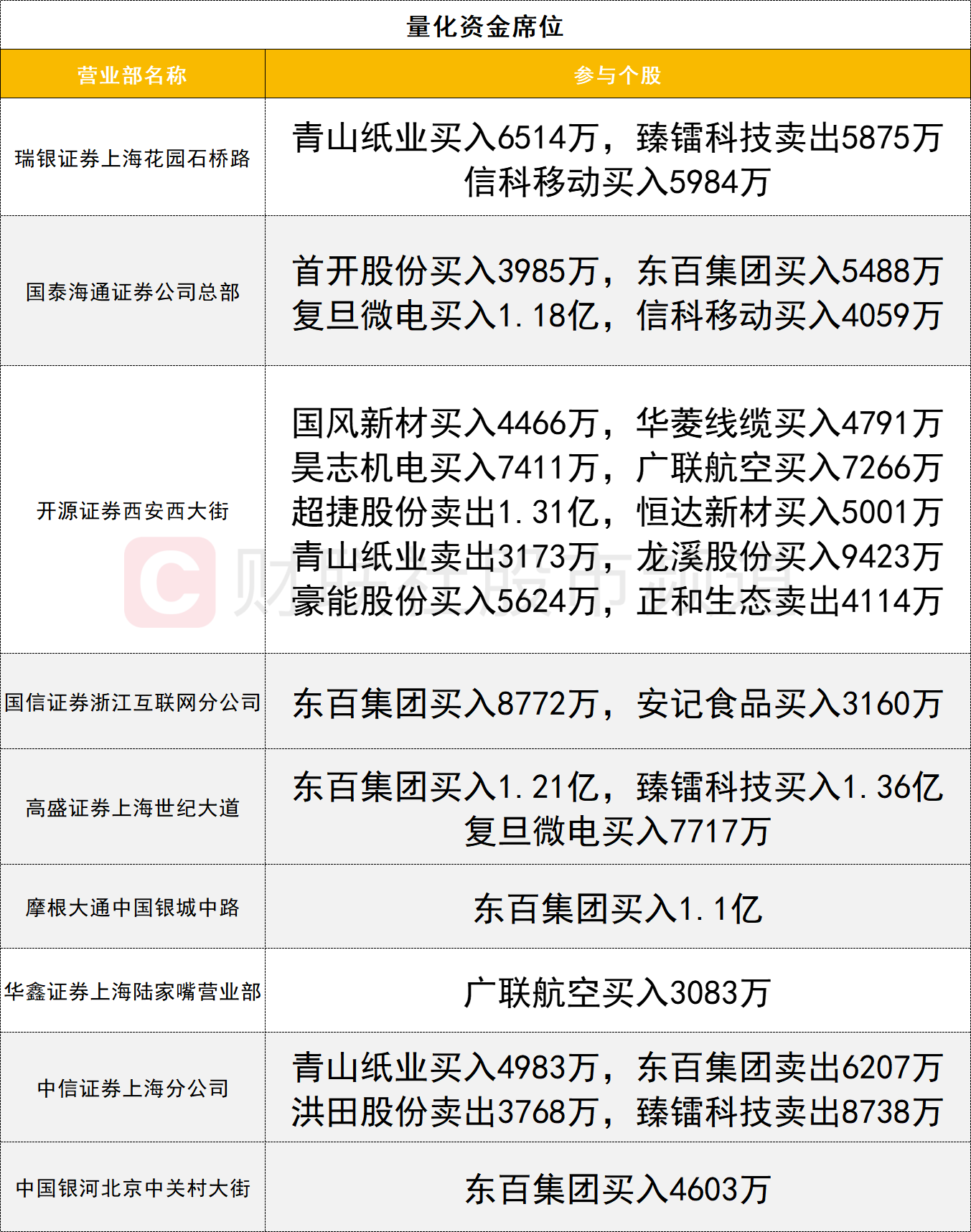 量化资金活跃度较高,东百集团遭六家量化资金激烈博弈,其中五家量化资金(高盛证券上海世纪大道、摩根大通中国银城中路、国信证券浙江互联网分公司、国泰海通证券公司总部、中国银河北京中关村大街)分别买入1.21亿、1.1亿、0.87亿、0.54亿、0.46亿,同时一家量化资金(中信证券上海分公司)卖出0.62亿。