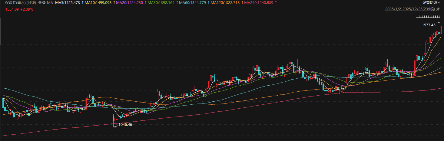 12月25日早盘A股保险股表现再次亮眼,一度涨幅达3.88%,位列A股所有板块第二名,盘中多只股票涨幅曾超过3%,其中中国太保(601601.SH;02601.HK)盘中触及43元/股,再创历史新高;中国平安(601318.SH;02318.HK)盘中最高涨幅为4.27%,71.98元/股的股价创2021年3月以来的最高价。