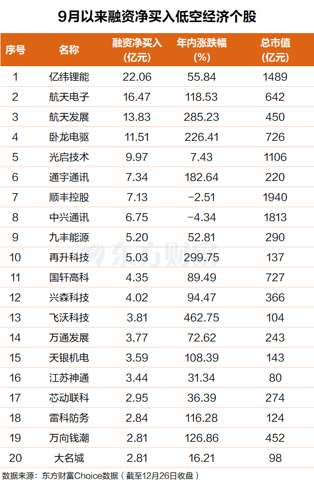 东方财富Choice数据显示,自今年9月以来,杠杆资金抢筹了一批低空经济概念股,其中亿纬锂能排名第一,融资净买入超22亿元;航天电子排名第二,融资净买入超16亿元。