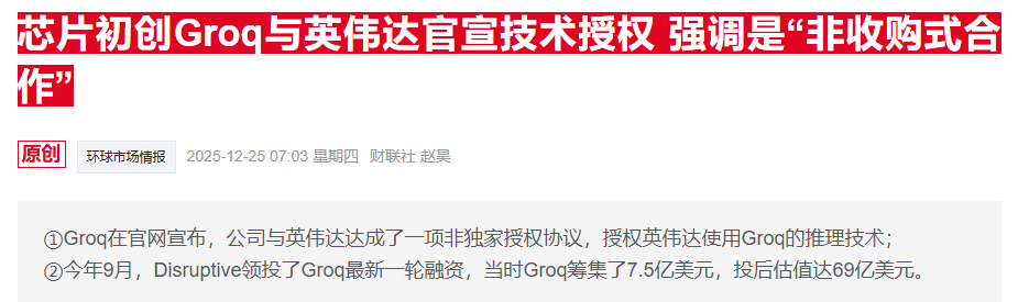财联社12月27日讯(编辑赵昊)两天前,芯片初创公司Groq宣布已与英伟达就其推理技术“达成非独家许可协议”,扭转了“英伟达斥资200亿美元收购Groq”这一传闻。