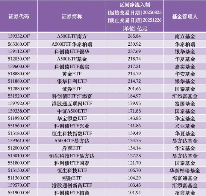 据Wind数据统计,在ETF规模从5万亿元增至6万亿元的4个月时间里,22只ETF累计净流入额超100亿元。