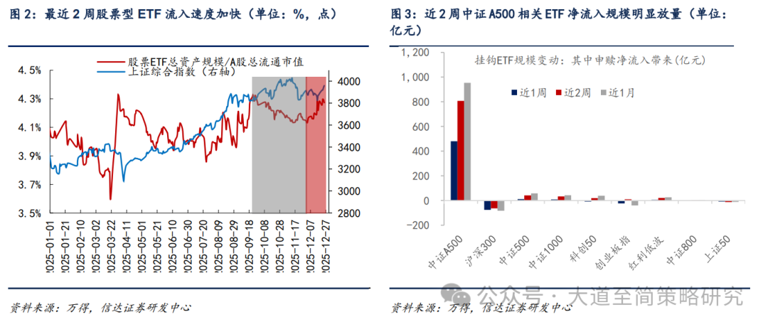 (2)资金面支撑之二:配置型资金加快布局。虽然当前指数估值分位不低,但在政策引导中长期资金入市的大背景下,跨年前后配置型资金的资产配置意愿明显提升。近期股票型ETF有加速流入的迹象,在宽基ETF内部与中证A500相关ETF净流入规模明显放量,我们认为这也侧面证明机构资金加快布局或成为资金面韧性的支撑。一方面,监管下调保险公司投资沪深300、中证红利低波动100指数等宽基指数的风险因子,腾挪权益头寸空间。同时“开门红”临近与负债端保费扩张预期,使得险资有进一步增配A股动力。相较于沪深300,中证A500行业分布更均衡,承接资金容量大,兼具长期底仓稳健性和新质生产力弹性,有望成为中长期资金更好的配置工具。另一方面,部分机构可能基于期权落地预期提前布局。