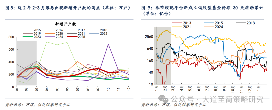 居民资金的季度性脉冲回升通常出现在Q1,从上证所新增开户数来看,近2年2-3月容易出现新增开户数的高点。历史上春节时间较晚的年份,比如2013年、2015年、2018年、2021年、2024年等,春季均在2月中旬,此时一季度基金发行最热的时候往往出现在1-2月份(除了2024年)。背后的原因可能是由于各行业年终奖发放时间、基金公司销售节奏会受春节影响。由此带来春节较晚的年份...