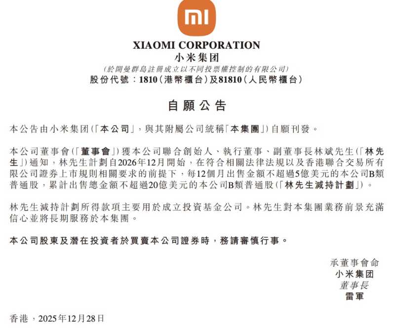 12月28日晚间,小米集团在港交所发布公告称,公司联合创始人、执行董事、副董事长林斌计划自2026年12月开始,每12个月出售金额不超过5亿美元的公司B类普通股,累计出售总金额不超过20亿美元。