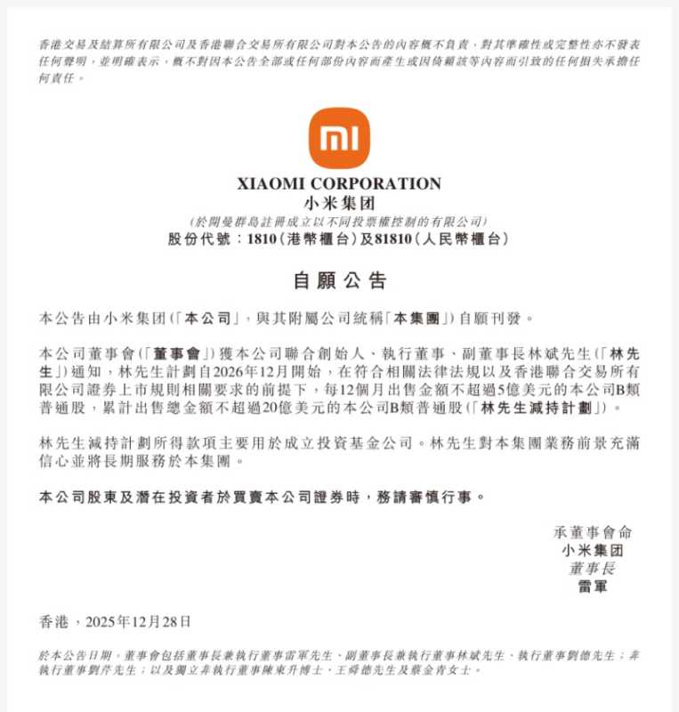 12月28日,小米集团在港交所公告,公司联合创始人、执行董事、副董事长林斌计划自2026年12月开始, 每12个月出售金额不超过5亿美元的公司B类普通股,累计出售总金额不超过20亿美元(约合140.21亿人民币)。公告显示,林斌减持计划所得款主要用于成立投资基金公司。林斌表示对集团业务前景充满信心并将长期服务于集团。
