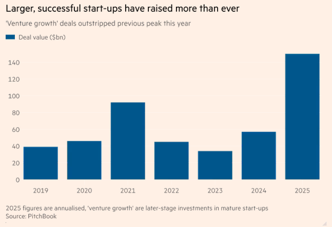 PitchBook数据显示,2025年美国最大的未上市企业融资额创下历史新高——远超2021年920亿美元的前纪录,因风投公司争相支持OpenAI和Anthropic等顶尖人工智能企业。