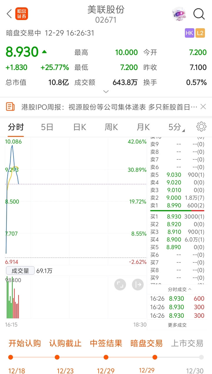 截至发稿,美联股份暗盘交易显示报价8.93港元,较招股价7.1港元上涨25.77%,每手300股,不计手续费,每手赚549港元。美联股份(02671.HK)将于12月30日(周二)在香港挂牌。 公司概况