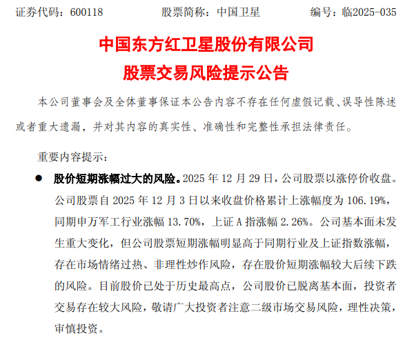 12月29日间, 中国卫星(600118.SH)公告称,公司股票自2025年12月3日以来收盘价格累计上涨幅度为106.19%,明显高于同期行业及上证指数涨幅,存在市场情绪过热、非理性炒作风险。公司基本面未发生重大变化,但股价已处于历史最高点,脱离基本面。公司最新滚动市盈率为1810.79倍,显著高于行业平均水平,存在估值偏高风险。同时,公司股票换手率较高,近期日均换手率高于日常水平。